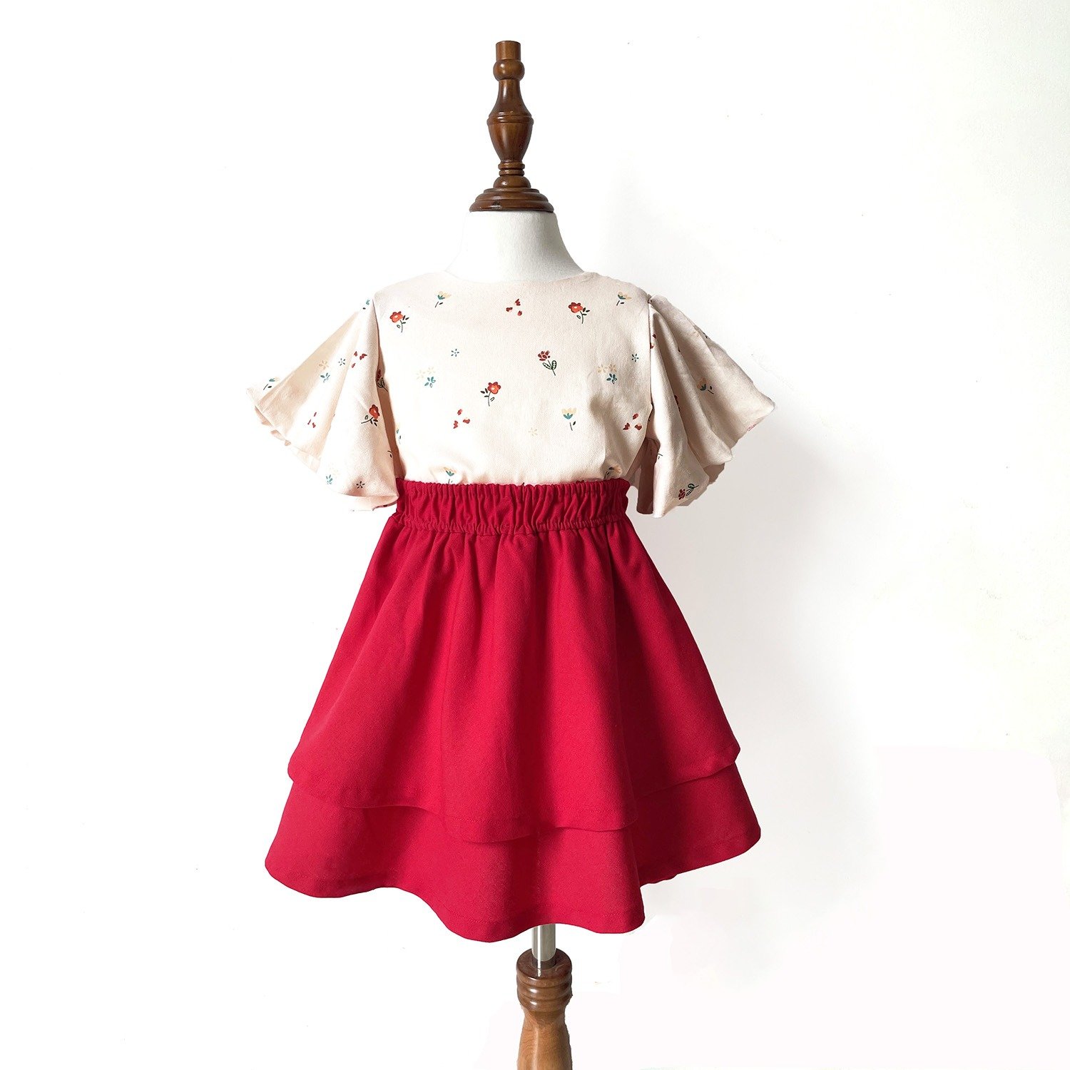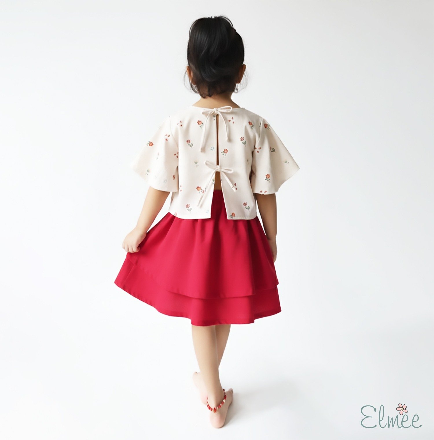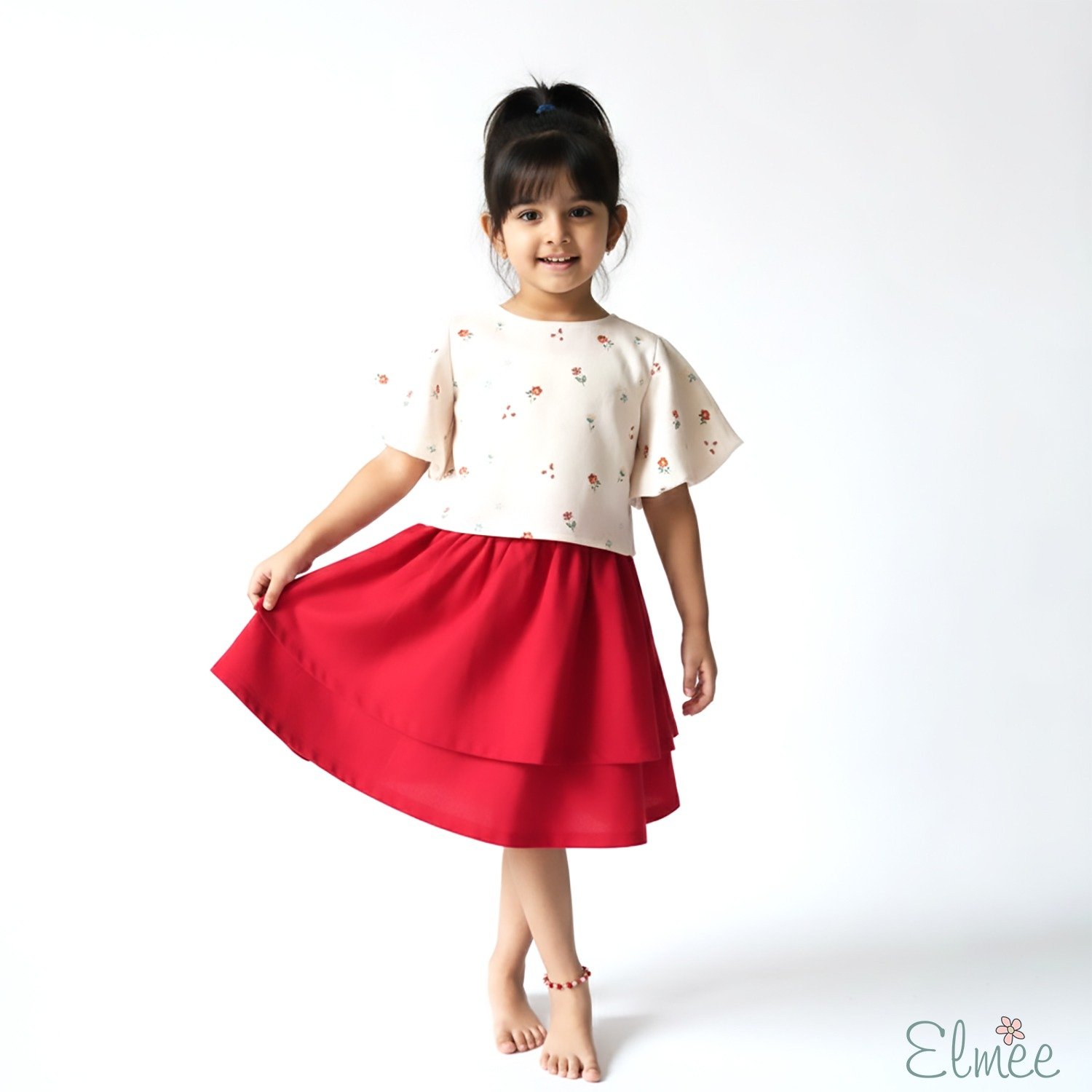 The Crimson Bloom Top & Skirt Set is a charming two-piece outfit designed for comfort and everyday elegance. The soft cotton floral top features flutter sleeves and delicate back tie detailing, adding a sweet handcrafted touch. Paired with a flowy linen skirt with a gentle layered hem and elasticated waistband, this set allows easy movement and a perfect fit for playful days.