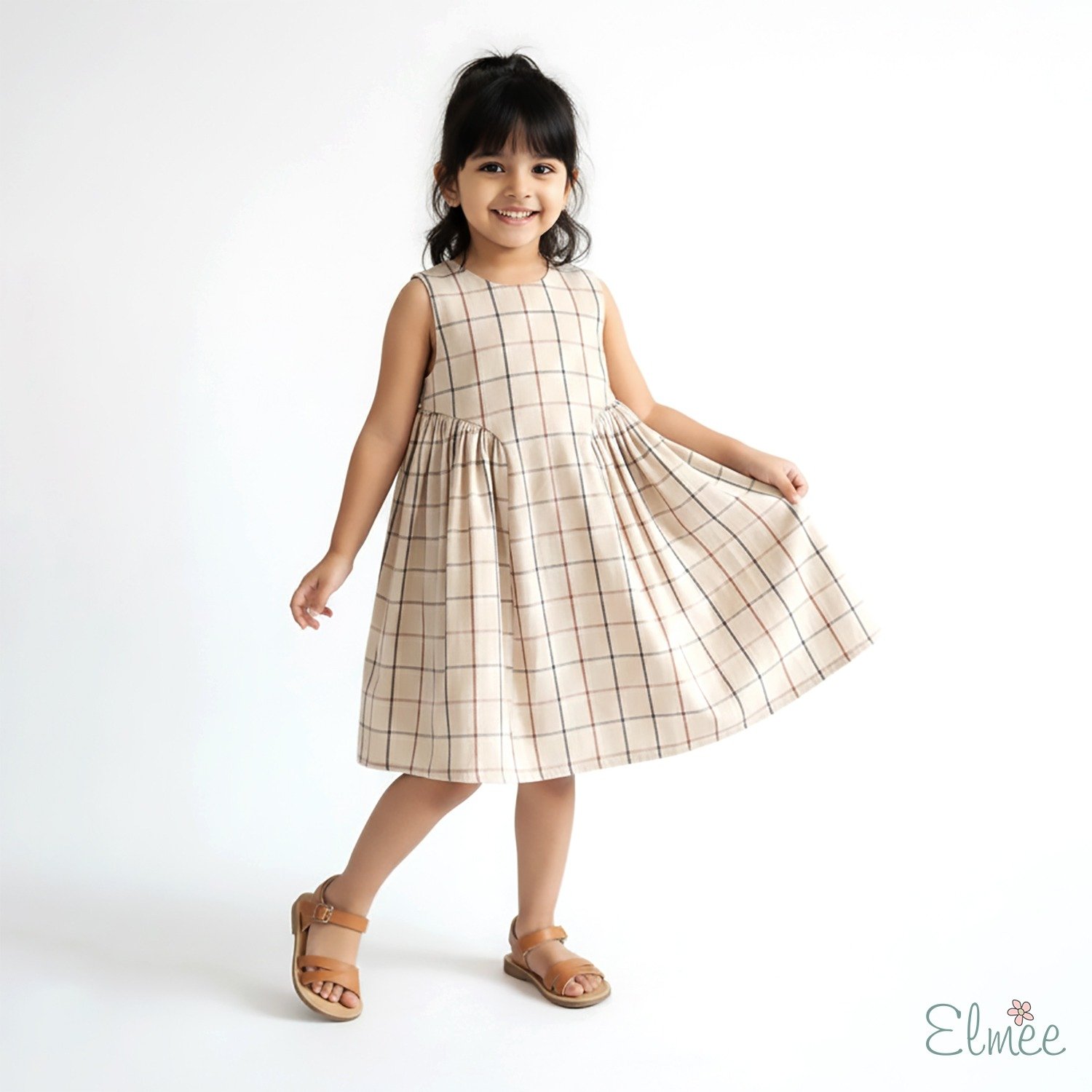 A timeless classic for little wardrobes, the Classic Check Basque Waist Dress blends simplicity with effortless charm. Crafted from breathable linen, this sleeveless dress features a soft neutral check pattern that gives it a refined yet playful look.