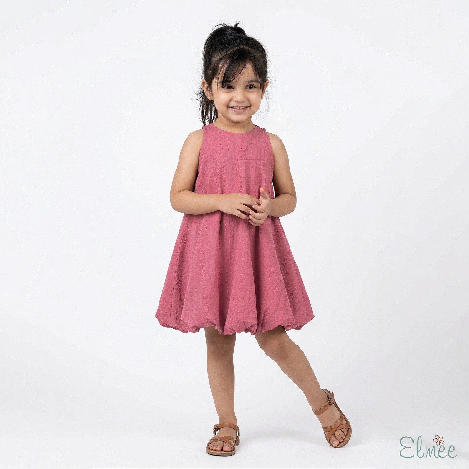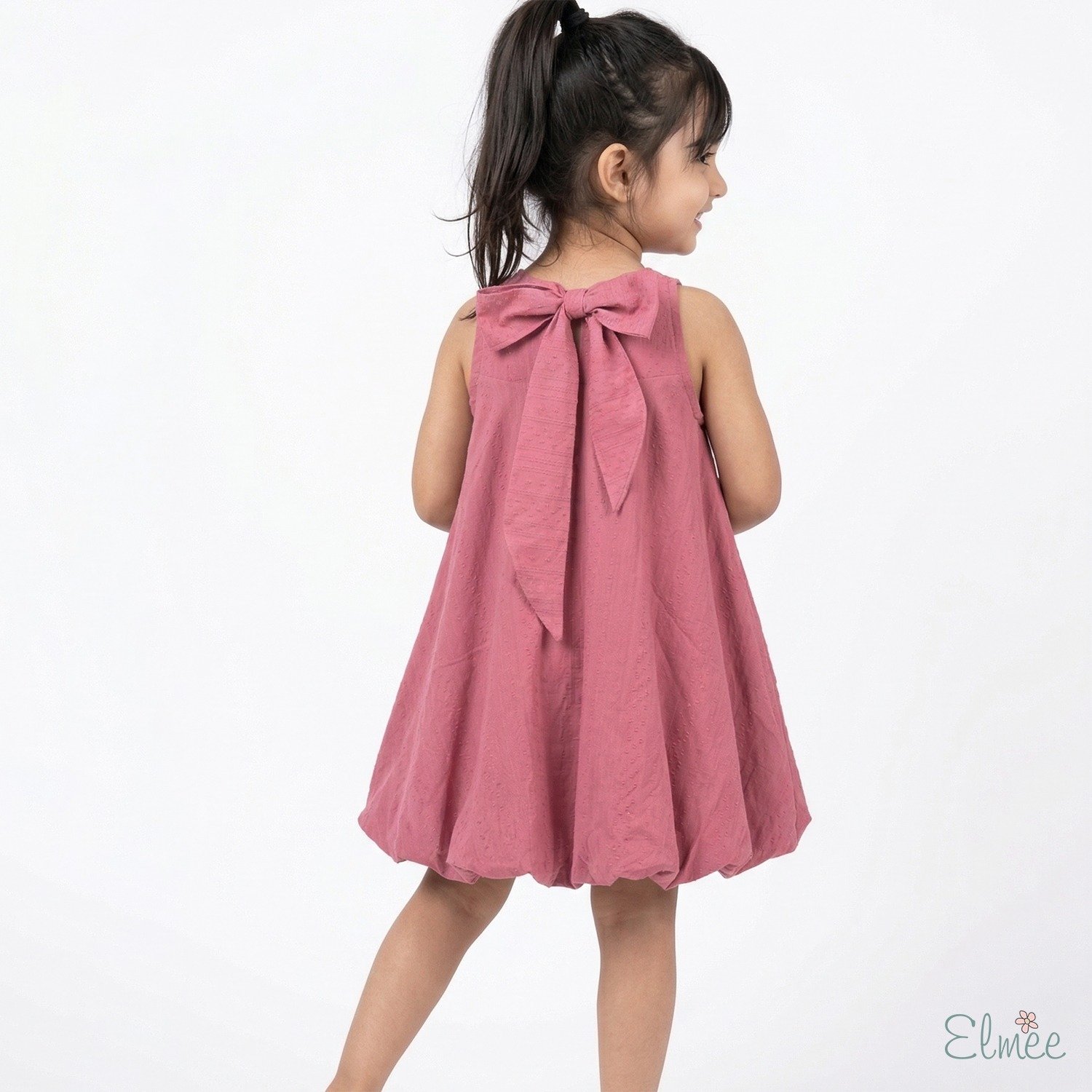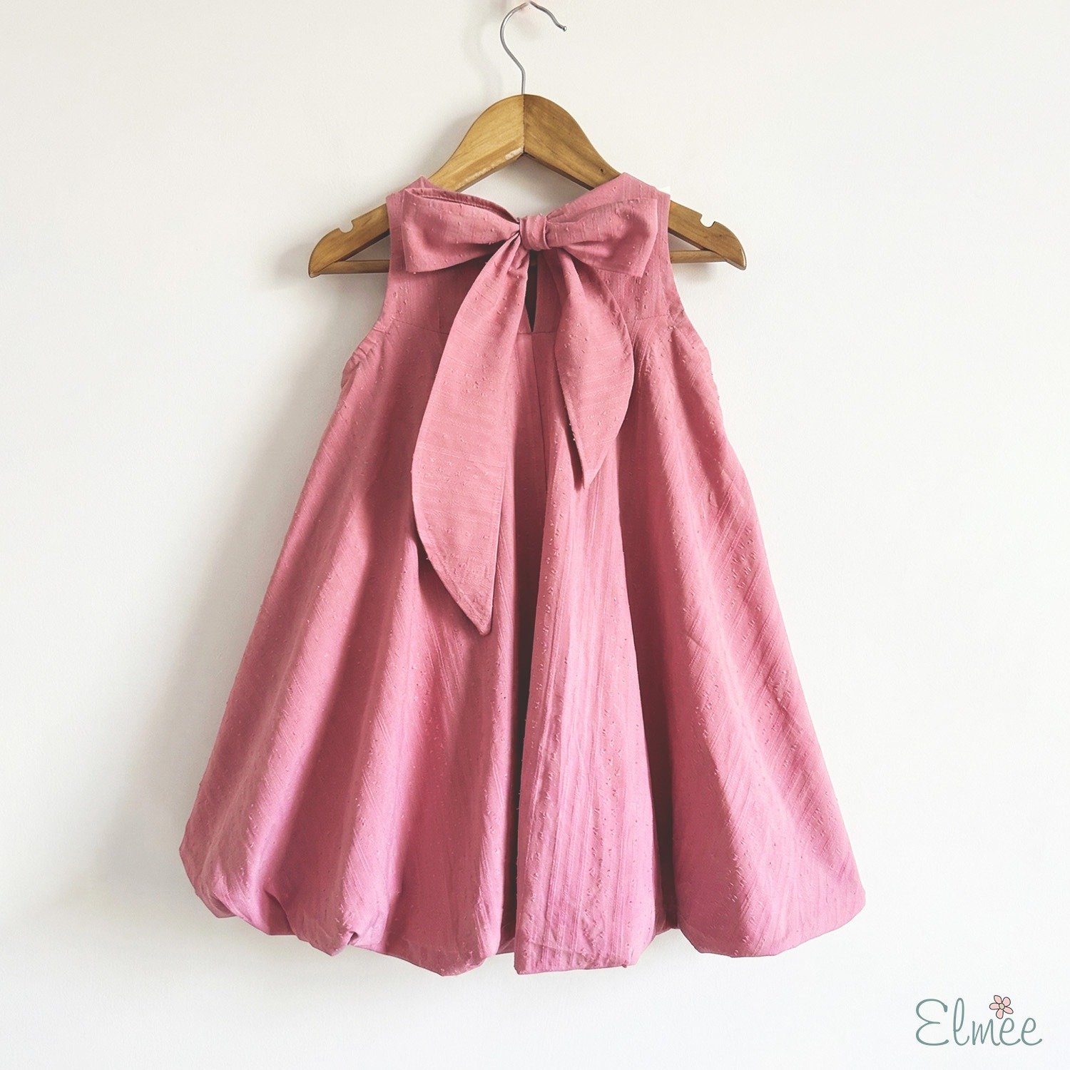 A textured cotton balloon dress in coral pink, finished with a statement back bow—playful, pretty, and perfect for any occasion.