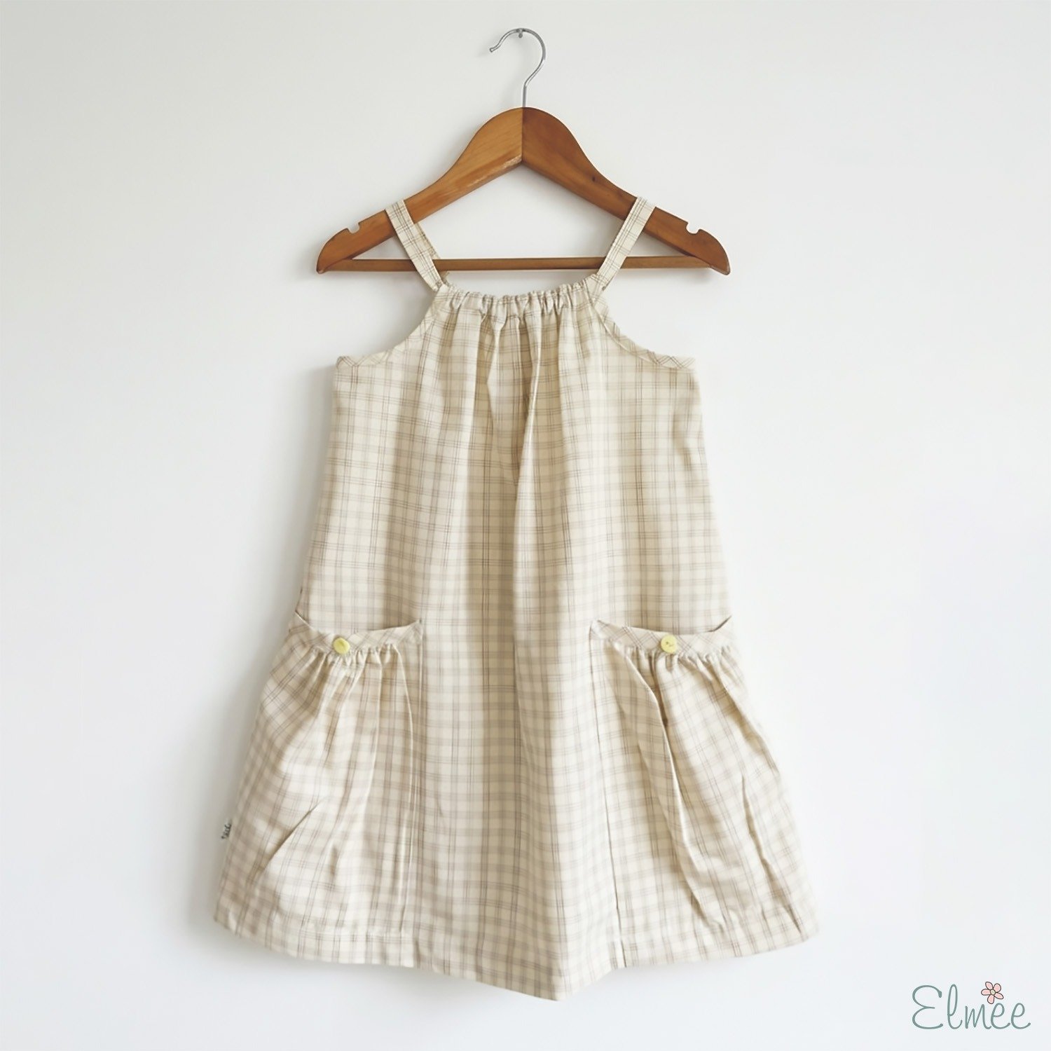 Designed in a subtle gingham check, this dress features a relaxed A-line silhouette with a gently gathered neckline for a breezy, comfortable fit. The shoulder straps provide ease of movement, while the lightweight fabric keeps little ones cool during warm days. Functional front pockets with delicate button details add both charm and practicality—perfect for holding tiny treasures.