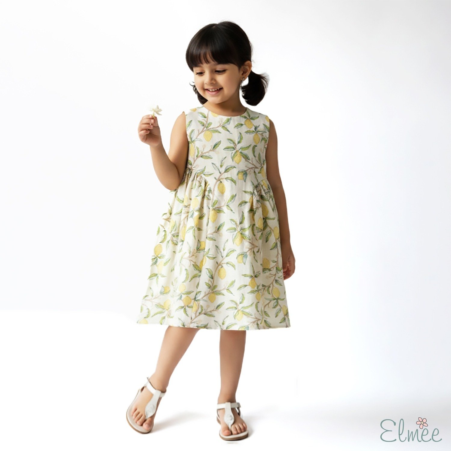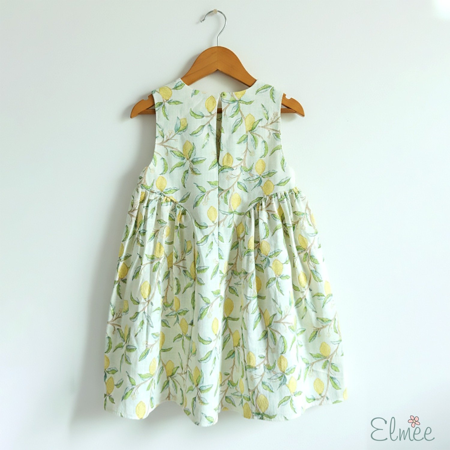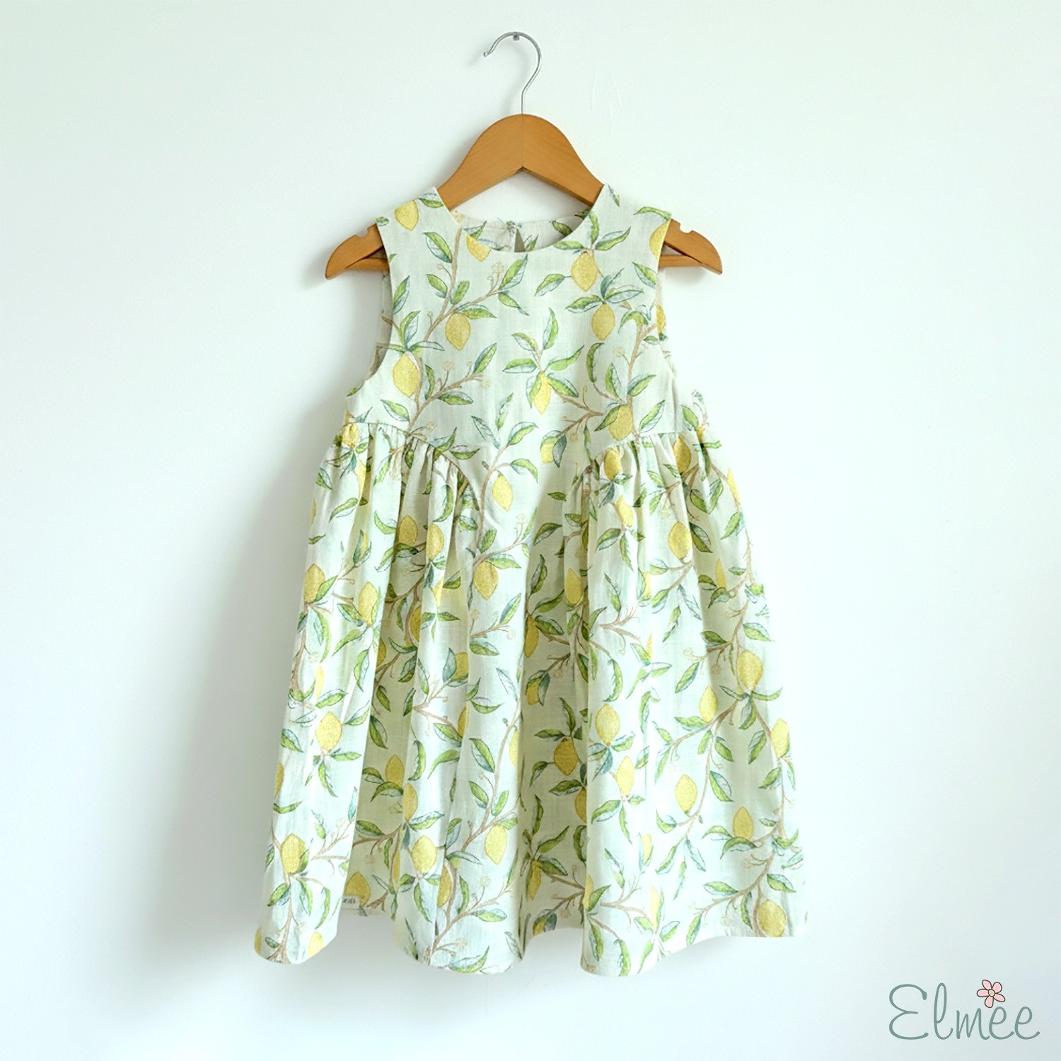 The beautifully shaped basque waist adds a soft, graceful structure, flowing into a gently gathered skirt that moves beautifully with every step and twirl. The delicate lemon and leafy print brings a refreshing, nature-inspired touch, making it perfect for playdates, outings, and special occasions alike.