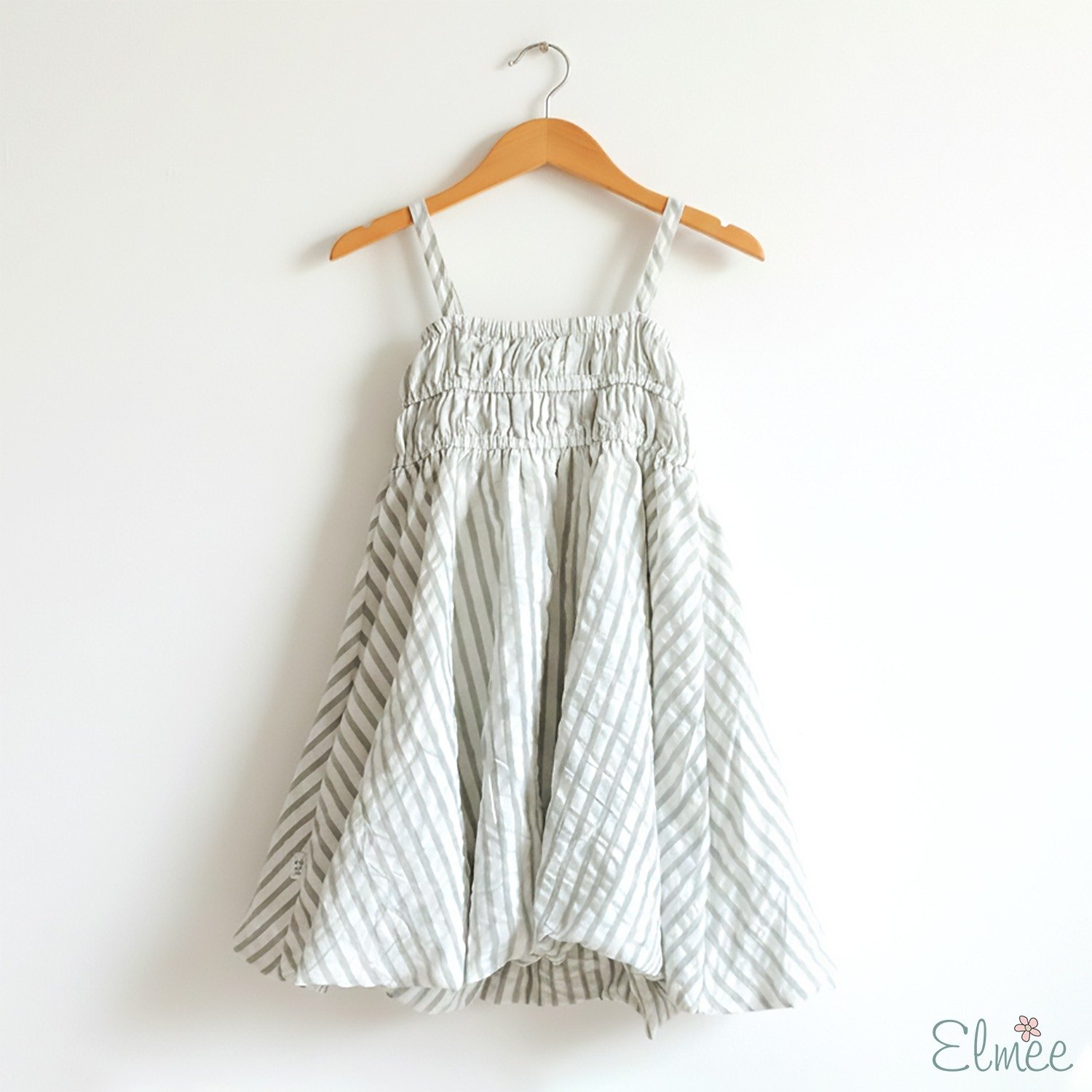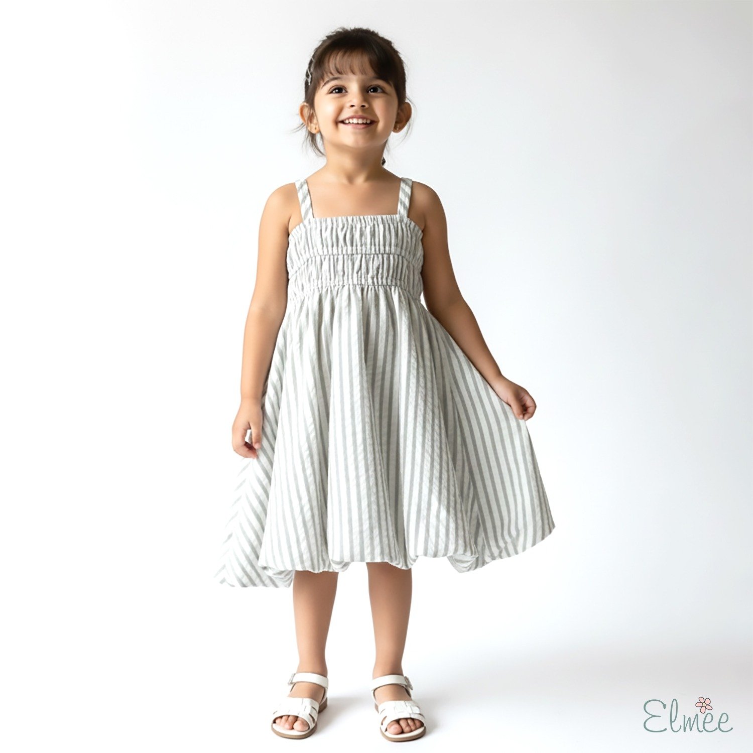 The dress features a softly smocked bodice that offers a flexible, comfortable fit, while slender shoulder straps keep the look airy and easy. Flowing into a beautifully flared skirt, the silhouette creates a gentle swish with every step, perfect for twirls and playful movement. The subtle striped texture in soft cloud-like tones adds a calm, fresh charm that feels timeless and effortlessly elegant.