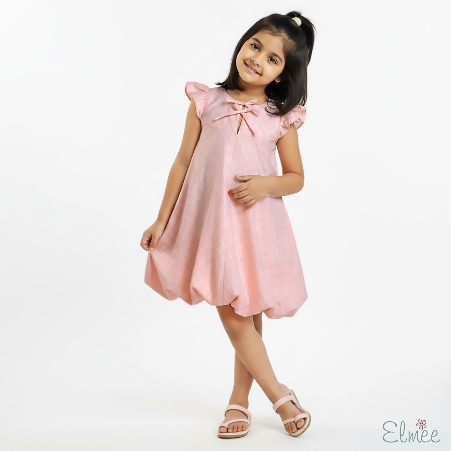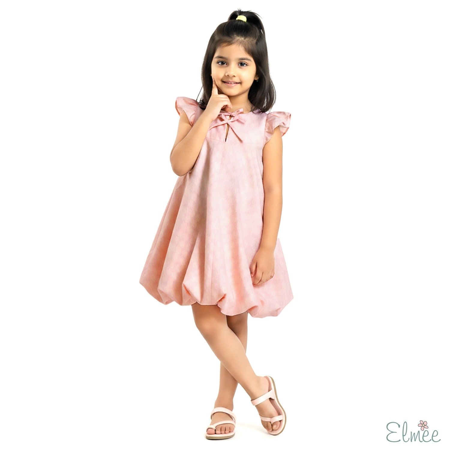 Its signature balloon silhouette creates a lovely rounded flare, giving the dress a bouncy, twirl-worthy movement that kids adore. The flutter sleeves and dainty bow detail at the neckline add a butterfly-like softness, completing the look with gentle elegance.
